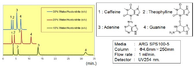 親水化合物一般是用反相模式來進行分離,例如使用C18填料。但是,仍然有很多親水的化合物不能用普通的反相模式來分離。近些年來,HILIC模式的填料應運而生,特別適合分離親水性化合物(極性大的化合物)。富士硅化學有限公司開發了HILIC模式的“ARG硅膠”。ARG硅膠可用于分離氨基酸、多肽、維生素和核酸。不同粒徑的ARG硅膠可分別應用于分析以及大規模的分離純化。