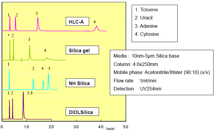 乙腈、THF和二氧六環通常溶解在水中作為流動相使用,而不會產生氫鍵相互作用。在高水相的條件下,洗脫時間變快。雖然反相體系常用于水溶性化合物的分離,但是HLC硅膠更適合用于極性化合物的分離。