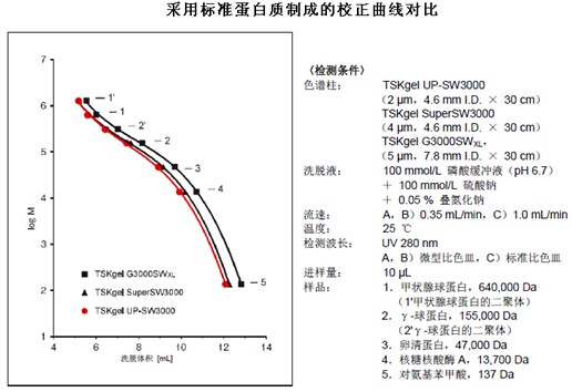 1.?對(duì)標(biāo)準(zhǔn)蛋白質(zhì)的分離(與現(xiàn)有產(chǎn)品SW系列色譜柱的比較)