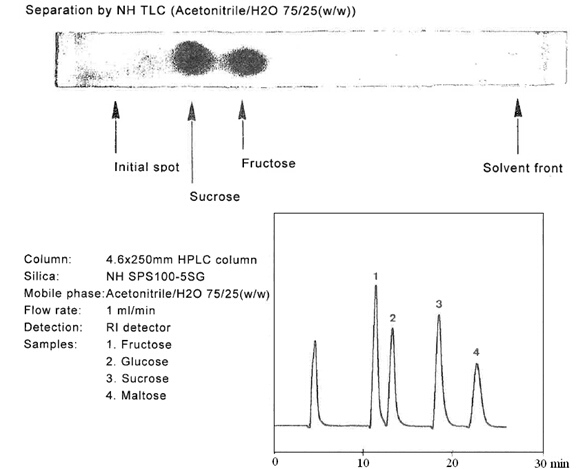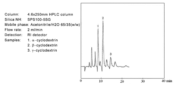 ? ? ? 糖類物質(zhì)的分析和制備,在液相色譜領(lǐng)域占有重要的地位。迄今為止,大多數(shù)的分離介質(zhì)僅僅局限在分析級(jí)別。但是富士硅膠研發(fā)出用于制備色譜的新的氨基硅膠。當(dāng)使用高水相為流動(dòng)相時(shí),一般的氨基填料會(huì)暴露出很多問(wèn)題。氨基硅膠的pH值很高,一般pH為9.0,在這樣高的pH條件下,目標(biāo)化合物一般都會(huì)變性,并且會(huì)毀壞硅膠基質(zhì)的表面。考慮到這些問(wèn)題,富士公司研發(fā)出新的氨基硅膠填料,稱之為NH SG硅膠。NH SG硅膠可以最小化甚至是避免上述問(wèn)題,并且對(duì)糖類化合物進(jìn)行更好的分離。