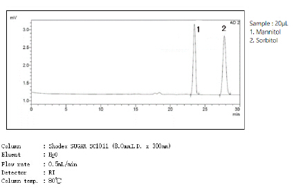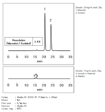 美國藥典USP規定,分析甘露醇使用符合L19填料要求的色譜柱,柱子尺寸7.8*300mm,甘露醇與山梨醇的分離度達到2以上。使用Shodex SUGAR SC1011-7F能完全符合美國藥典要求。