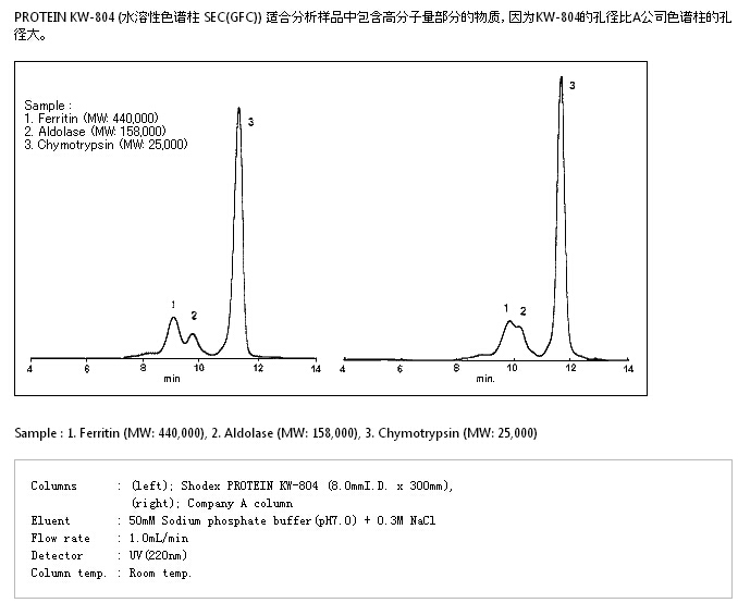 KW-804色譜柱是硅膠基質(zhì)的水溶性SEC色譜柱,適用于蛋白質(zhì)和酶的分析。