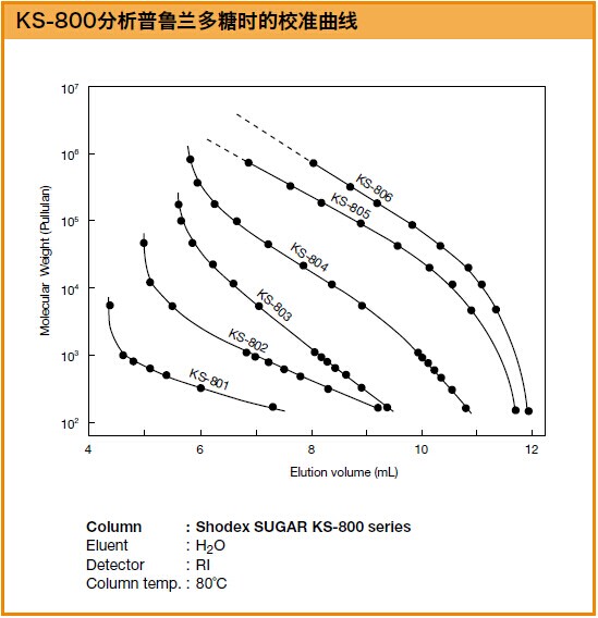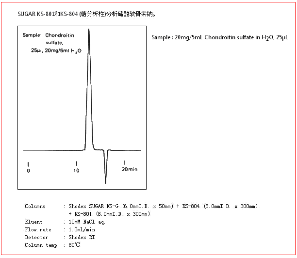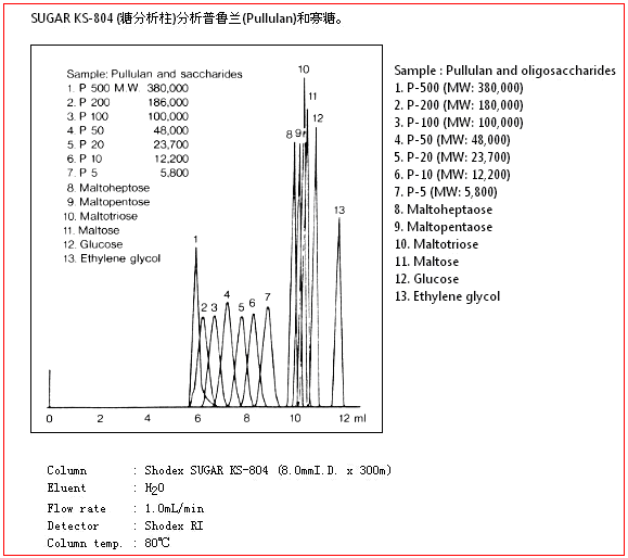 SUGAR KS-804色譜柱是以聚苯乙烯-二乙烯基苯為基質的,分離原理結合了配體交換色譜法和尺寸排阻法,主要用于糖類的分離。用水做流動相即可分離中性糖。