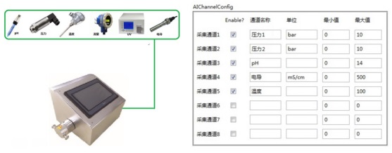 系統(tǒng)提供8路傳感器通道,可接受4~20mA及-10V~+10V的信號輸入,可連接絕大部分類型的傳感器,比如:壓力、溫度、流量、電導、pH、UV等。