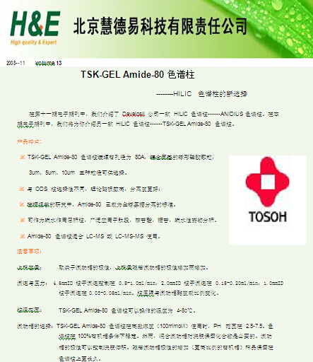 This introduction: Develosil C30 色譜柱可以為您提供非同尋常的選擇性,可使用 100%水溶液流動相,在高達 60°C 的溫度下使用。專利的 C30 鍵合技術適合分離極性物質(如糖和核酸)及脂溶性化合物(如維生素 E 和類胡蘿卜素)。